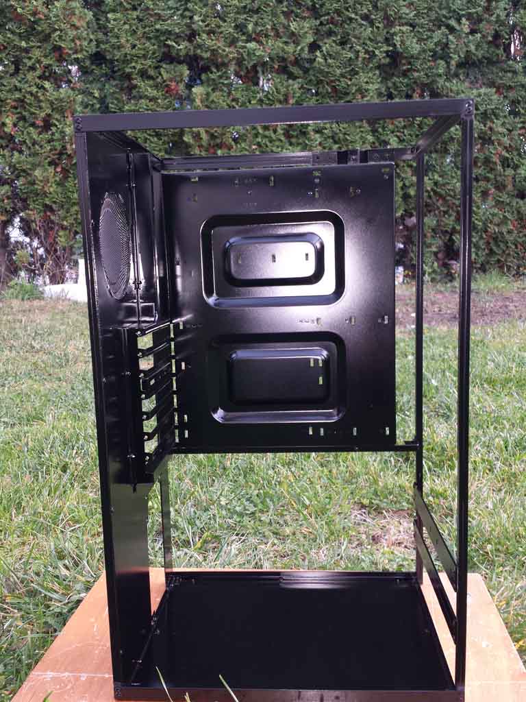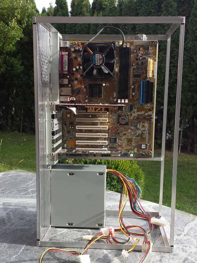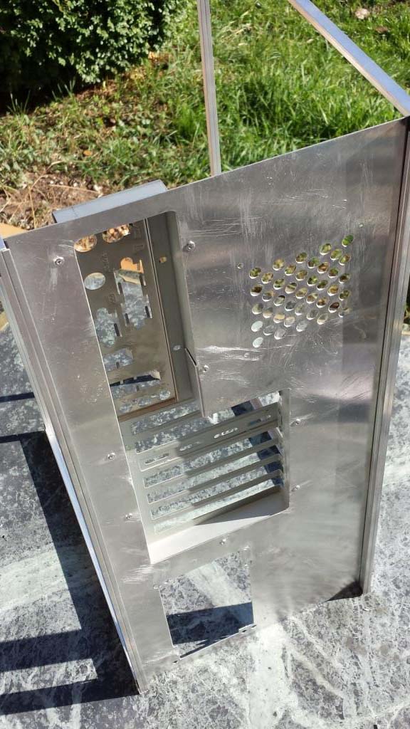 Die Idee basiert auf dem lian li pc-x500fx, aber dennoch kein direkter Nachbau.Die Konstruktion des Gerüsts ist für das volle ATX-Mainboard aber sehr einfach und kompakt gehalten. Zum verbinden benutze ich Alu-Nieten, weil diese nicht allzu weit rausschauen.
